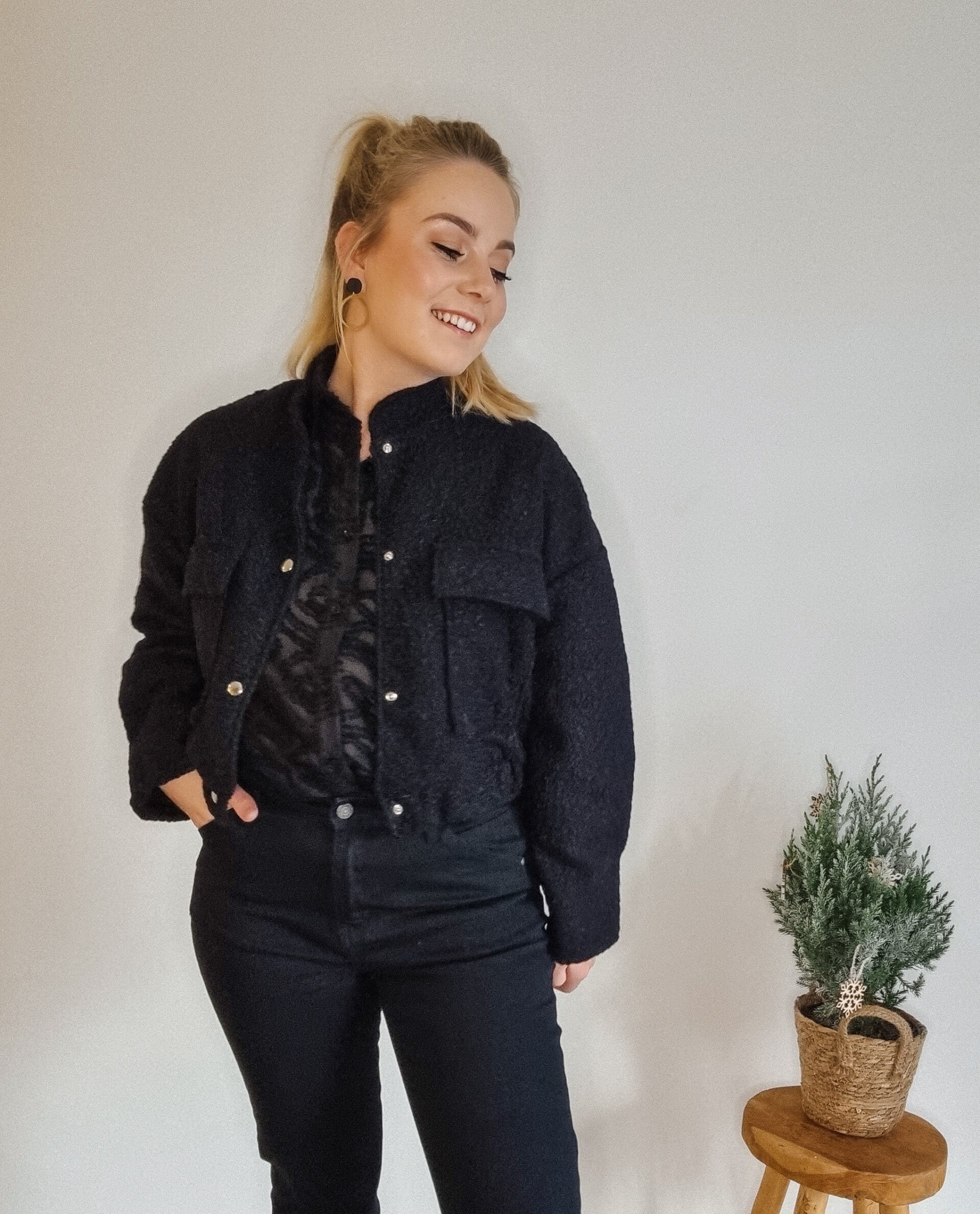 Kort Teddy jasje. Staat heel leuk op een hoge broek of een jurkje.