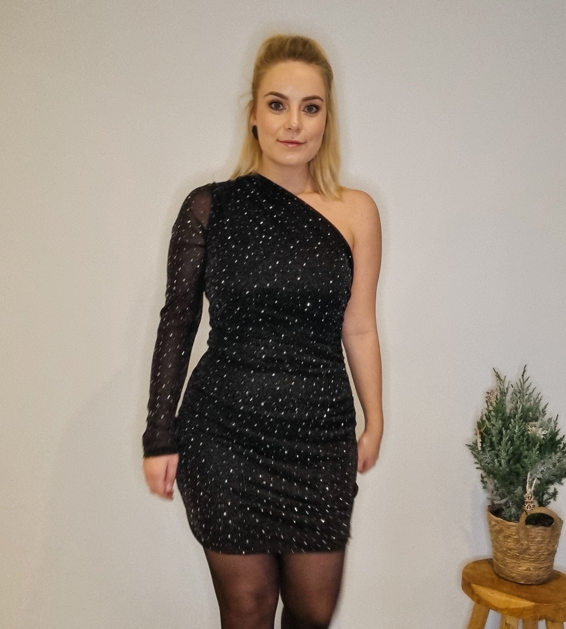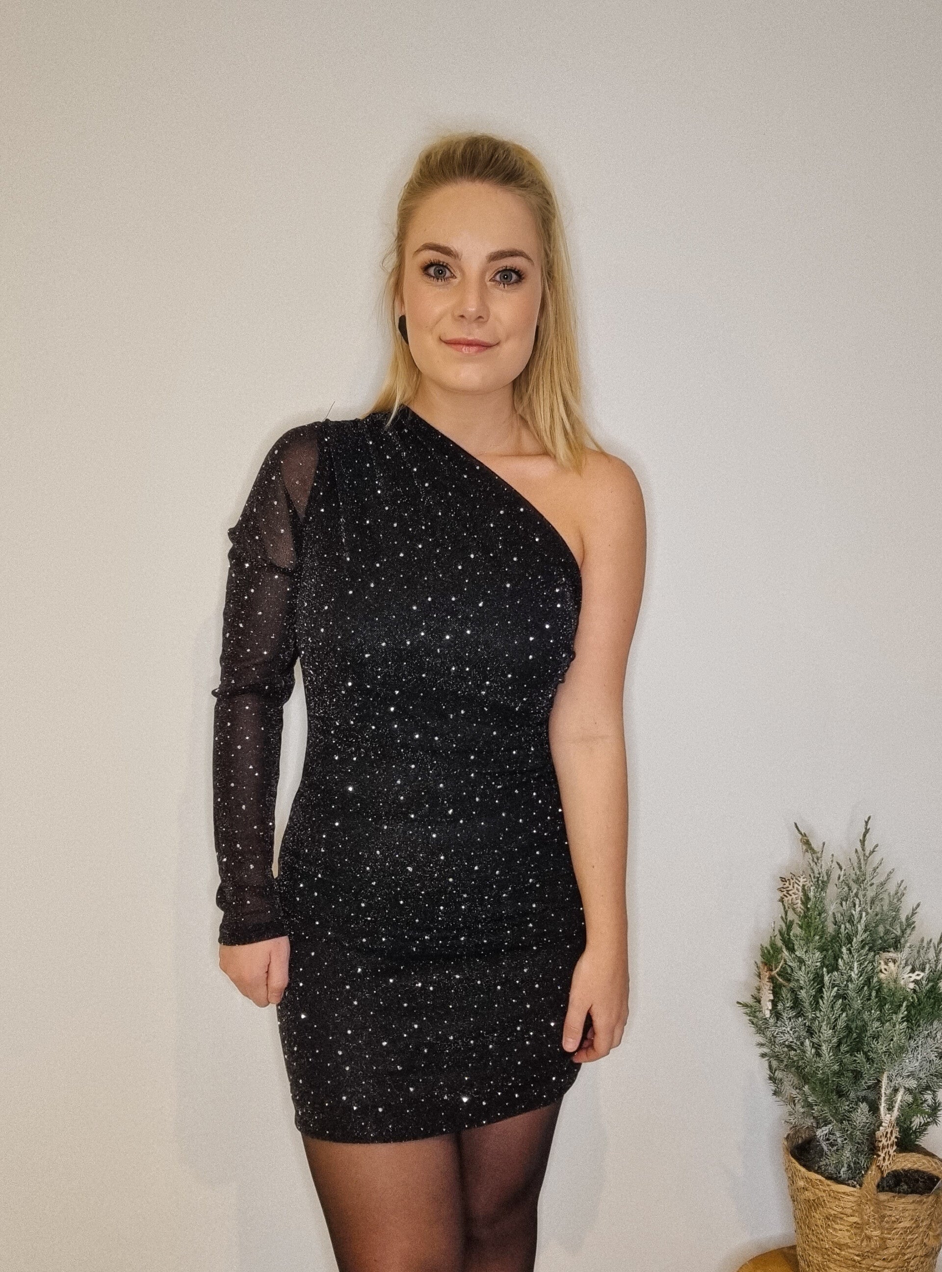 Pop the champagne! Super leuk one-shoulder jurkje met steentjes.