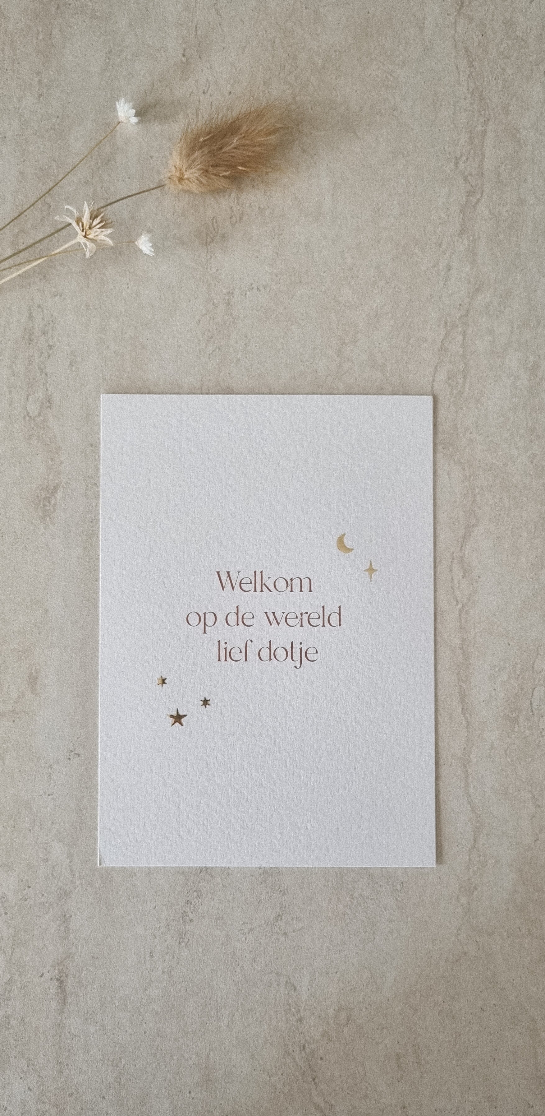 Gedrukt op papier met een subtiele structuur. De tekening is afewerkt met goudfolie, wat de kaart net dat extra geeft.