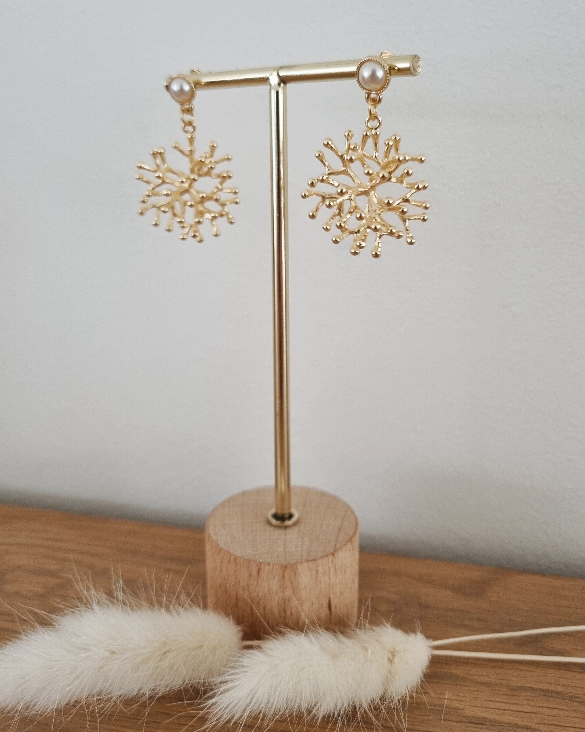 Goude oorbellen die me doen denken aan het koraal in de zee.
