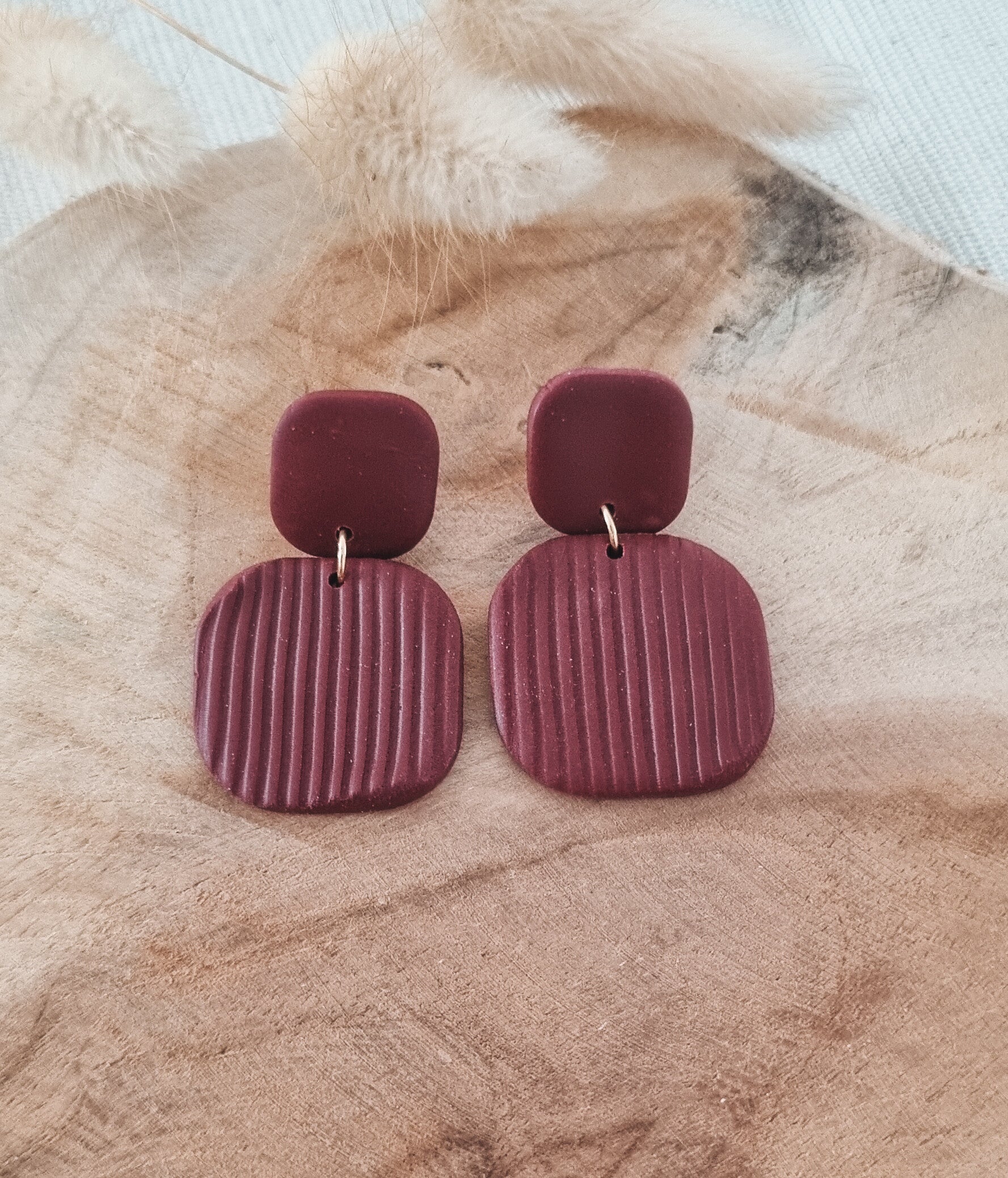 Bourdaux-kleurige oorbellen met subtiel reliëf om je outfit helemaal af te maken.Lengte: +/- cm° Deze oorbellen zijn volledig handmade. Het kan dus zijn dat imperfectie aanwezig zijn.