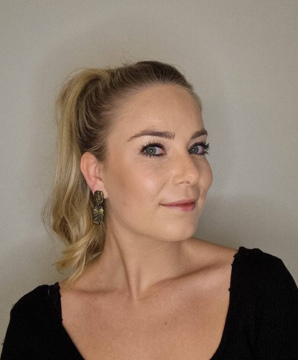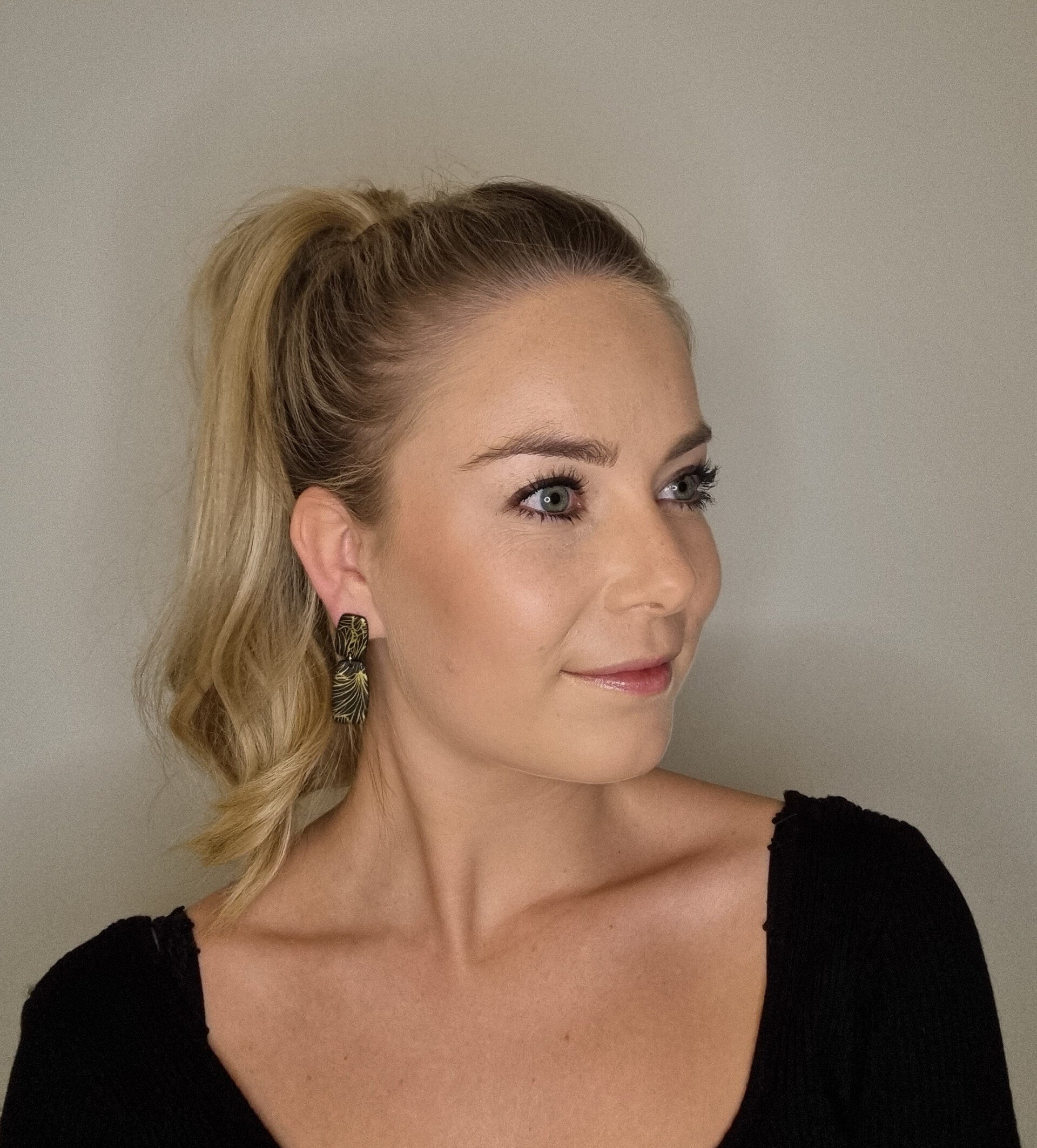 Zwart-kleurige oorbellen met een goudkleurige print om je outfit helemaal af te maken.